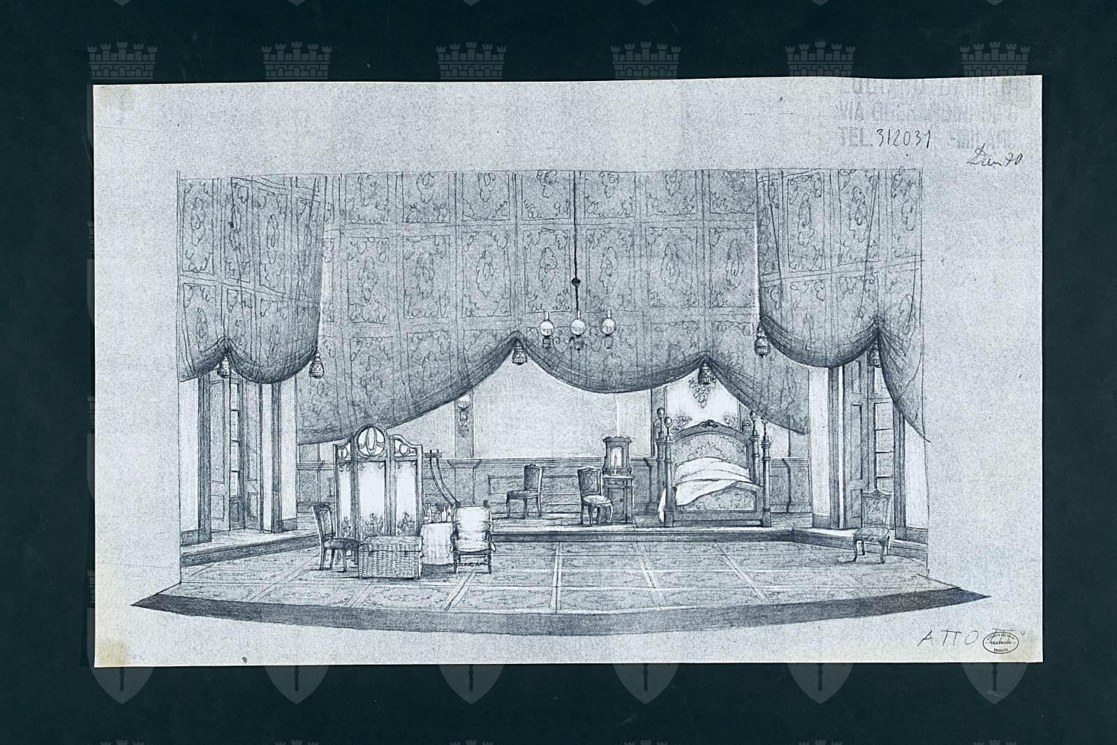 Scenografia per La traviata, opera in quattro atti di Giuseppe Verdi, Trieste, Teatro Verdi, stagione lirica 1970/1971. Regia e scene di Luciano Damiani