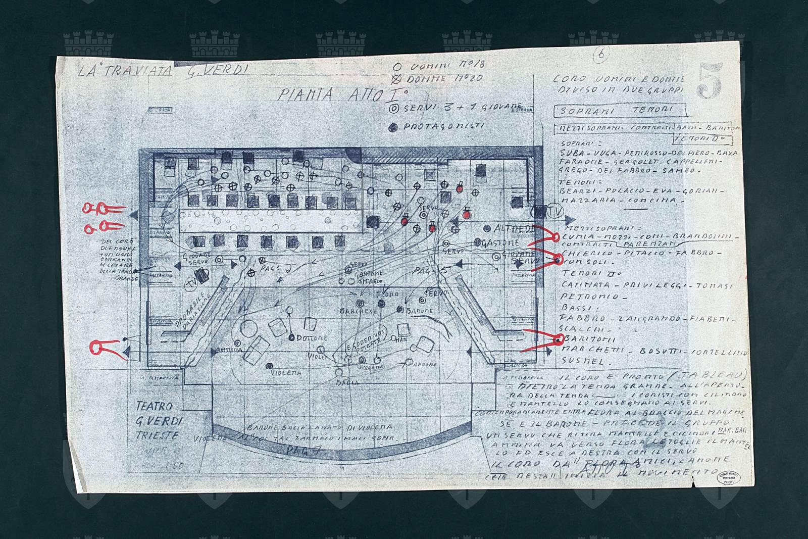 La traviata, opera in quattro atti di Giuseppe Verdi, atto 1. Disegno in scala 1:50 della sala descritta nella scheda CMT OA 75686 con indicazioni sui movimenti scenici degli interpreti e annotazioni di illuminotecnica