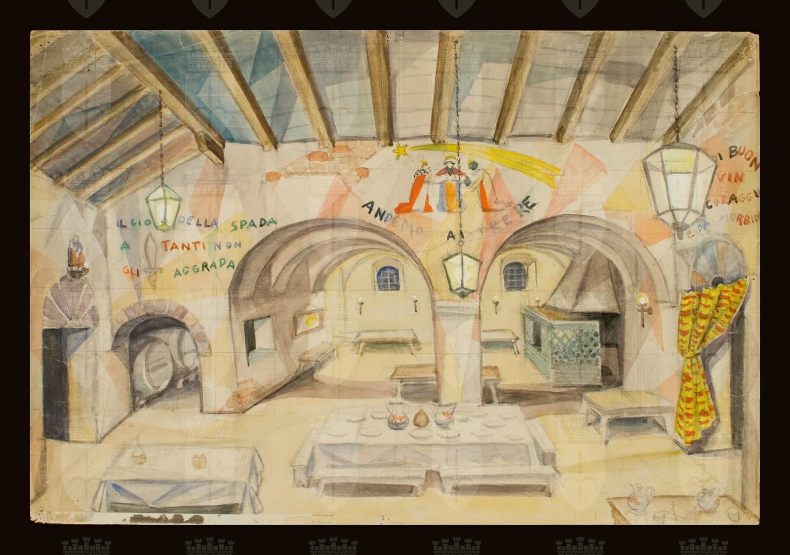 Trittico, opera di Antonio Illersberg, Carneval. interno di cantina/ taverna "Ai tre re", ambiente caratterizzato da due grandi archi e soffitti a volta, tavolo lungo apaprecchiato al centro, altri tavoli sparsi, botti e focolare. Disegni e scritte sui muri: Il gioco della spada a tanti non gli aggrada, andemo ai tre re, ...buon vin dà coraggio e dà morbin.