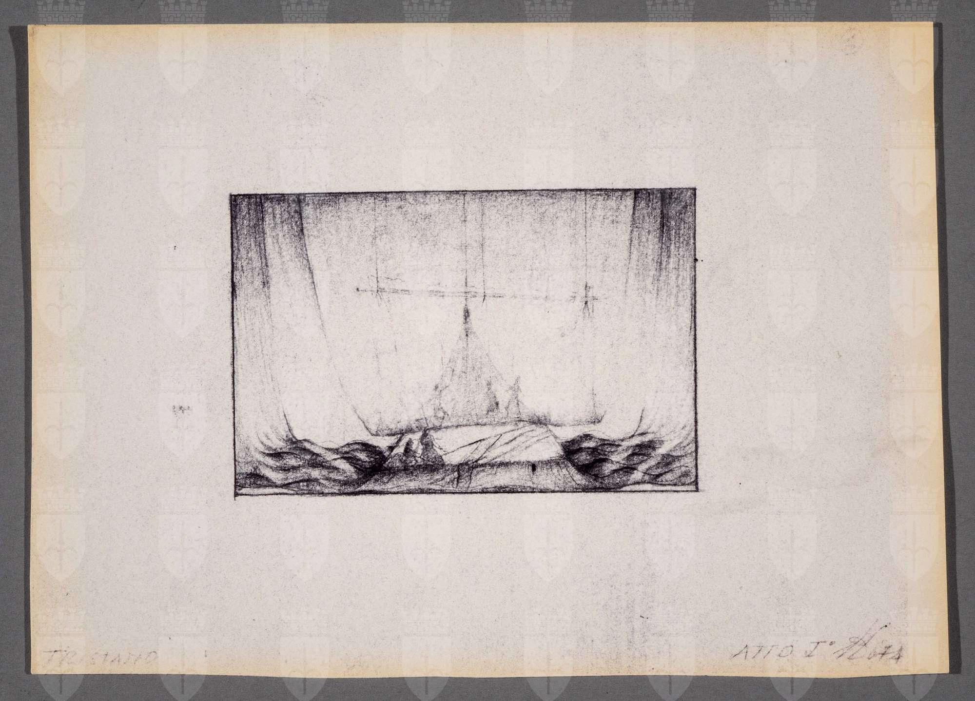 Tristano e Isotta, opera di Richard Wagner. Atto 1. Struttura triangolare al centro, in mezzo ad un mare ondoso fatto di veli su cui stanno figure umane. Un altro velo scende dal soffitto.