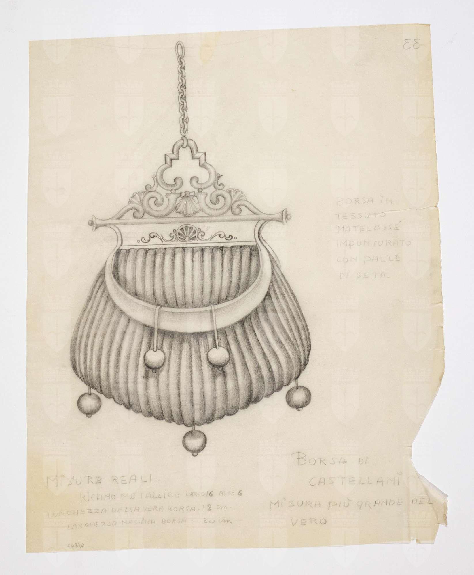 Il gioco dei potenti, libero adattamento di Giorgio Strehler da Enrico VI, dramma storico di William Shakespeare, in 15 atti e 2 giornate. Borsa in tessuto a coste con pendagli sferici ed elaborata placca metallica alla chiusura, tramite la quale è appesa una catenella ad una cintura appena accennata.
