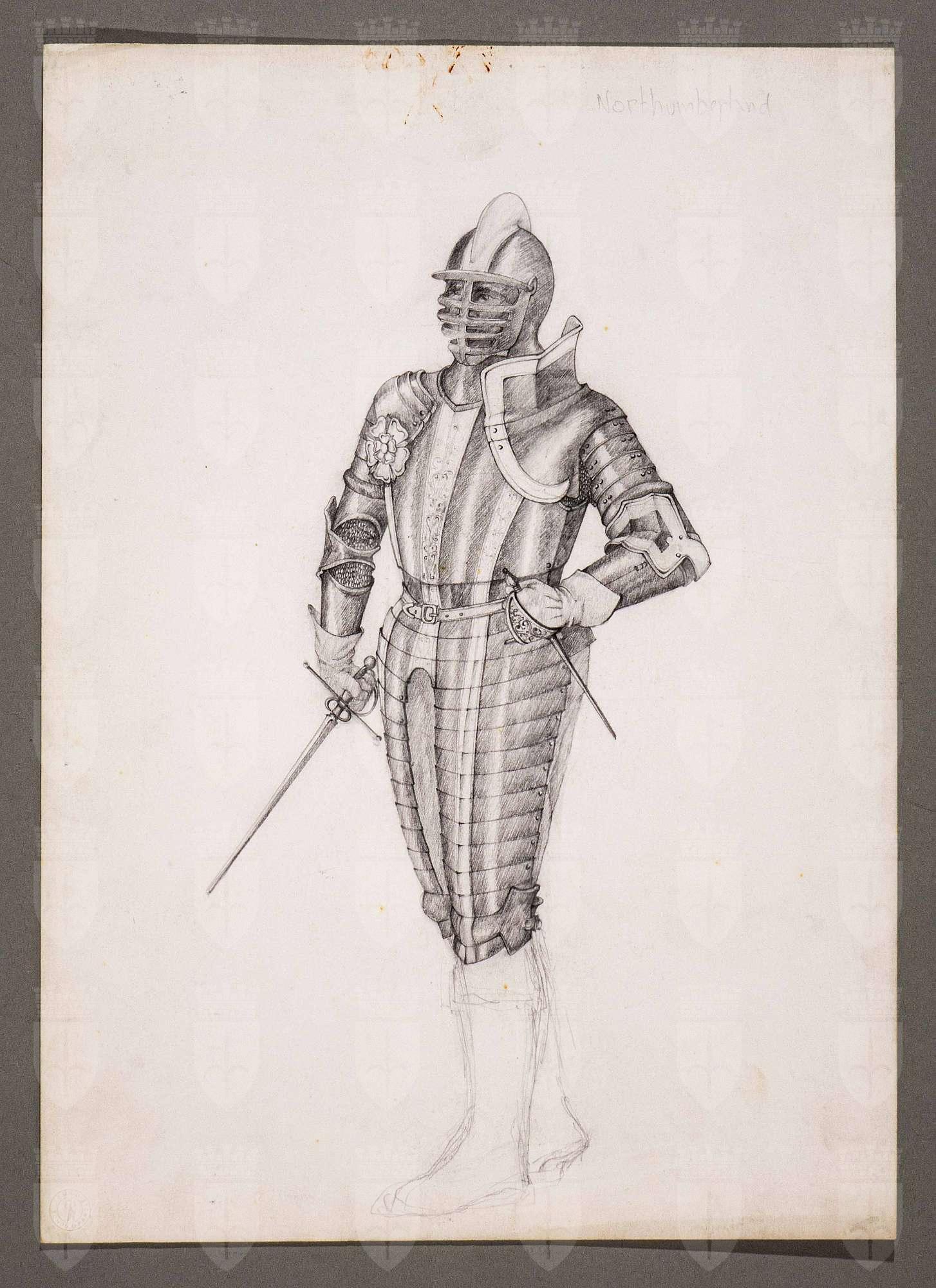 Il gioco dei potenti, libero adattamento di Giorgio Strehler da Enrico VI, dramma storico di William Shakespeare, in 15 atti e 2 giornate. Figura maschile in piedi, di tre quarti verso sinistra, indossa un'armatura completa di elmo con visiera abbassata e guanti lunghi. Regge uno spadino con la mano destra e un pugnale con quella sinistra. La parte bassa delle gambe è appena accennata