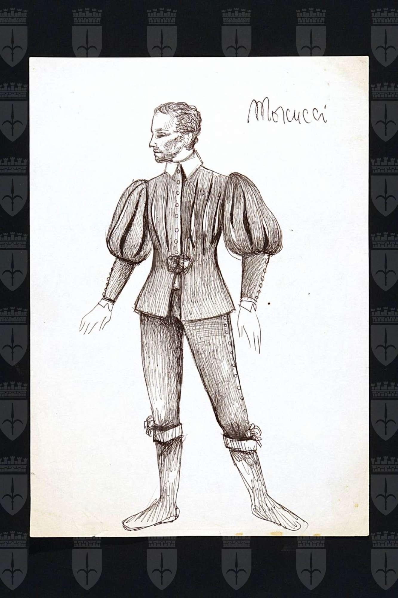 Come vi piace, commedia pastorale. FIgura maschile intera di fronte, testa girata di profilo verso sinistra, in abito cinquecentesco, brache al ginocchio chiuse da fiocchi, giubba con spalle gonfie, stivali al ginocchio.