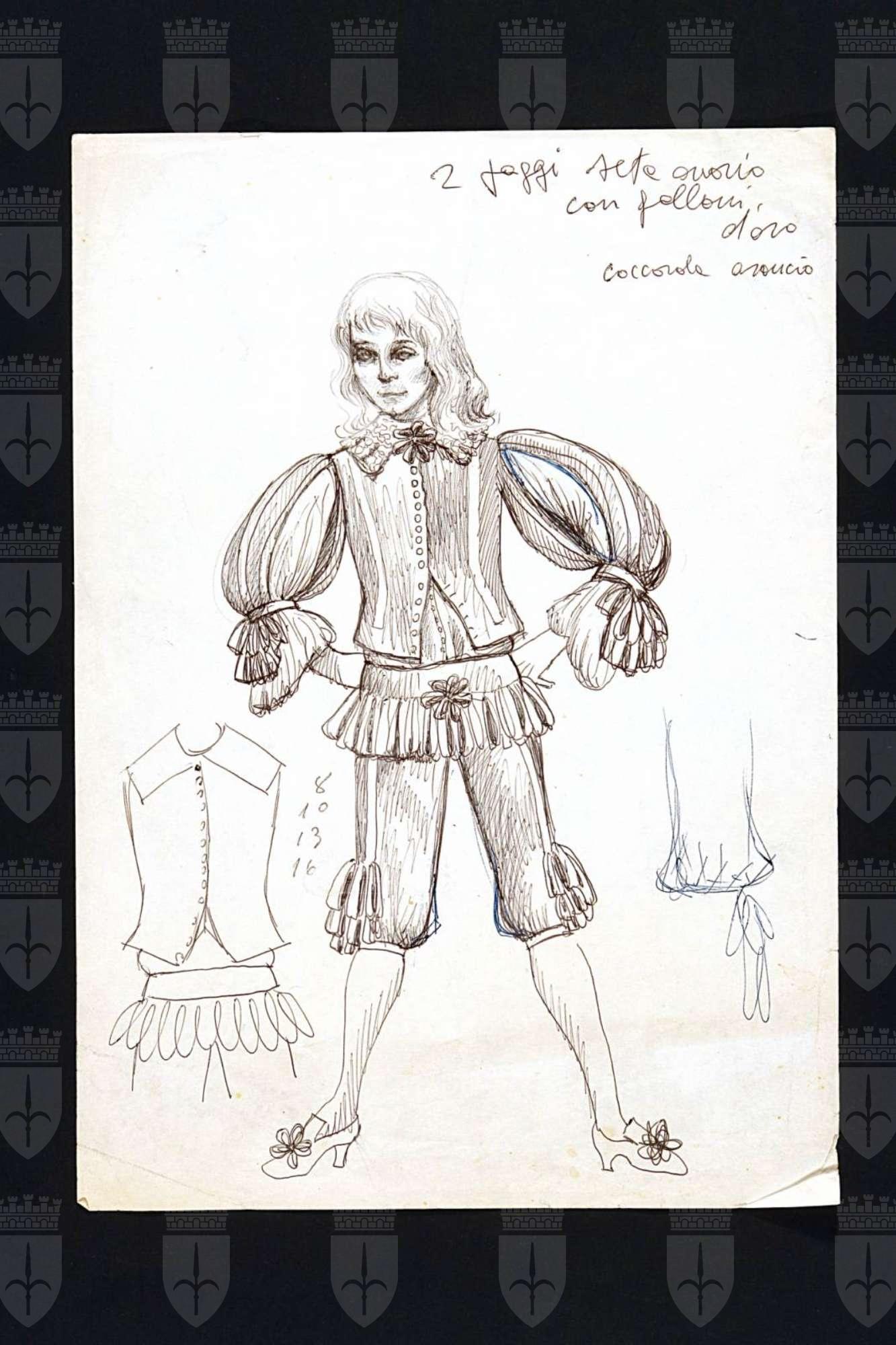 Come vi piace, commedia pastorale. Figura di giovane in abiti cinquecenteschi, con pantaloni a palloncino e stivali alti