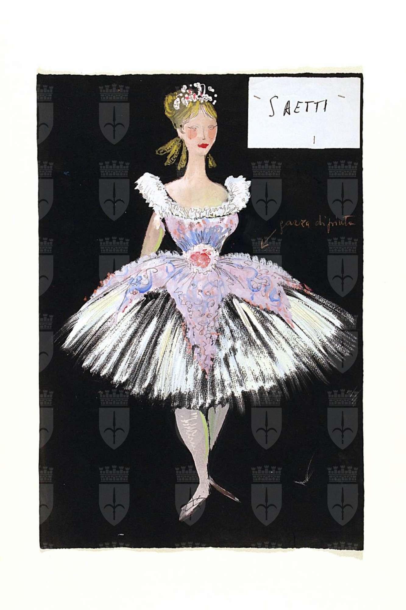 Figura femminile intera in costume da ballerina. Bustino rosa e lilla con fiore (coccarda?). in vita e scollatura bordata di ruches. Gonna in tulle, coperta, nella parte alta, da uno strato della stessa stoffa del bustino tagliata a forma di stella. Acconciatura con fiori.