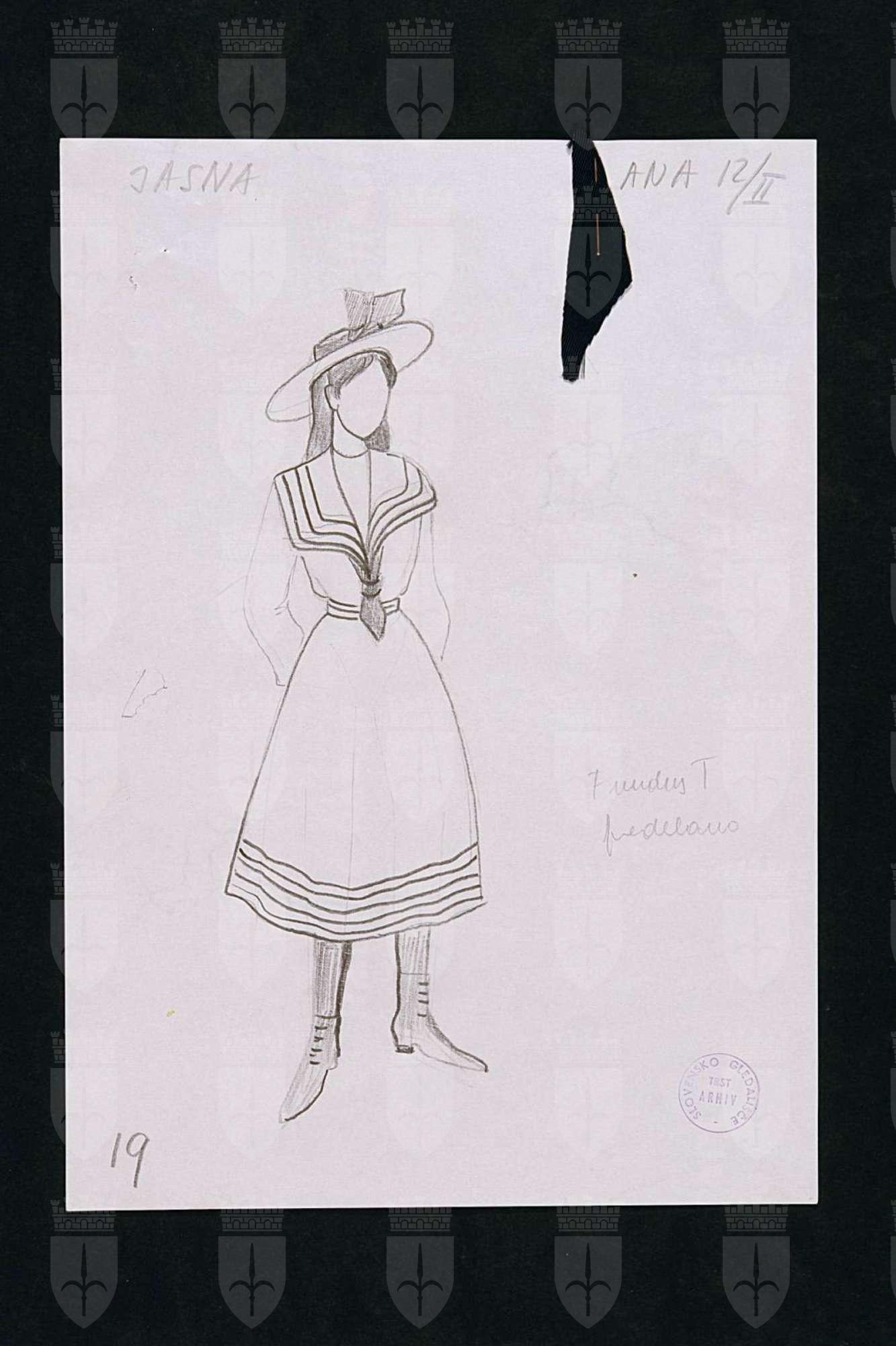 La coscienza di Zeno (Zenova Izpoved), di Italo Svevo nel rifacimento scenico di Tullio Kezich. Costume per Ana. Figura di bambina intera, abito a mezza lunghezza modello alla marinara, con orlo rigato a fondo gonna e sul collo a V, cappello con fiocco, stivaletti