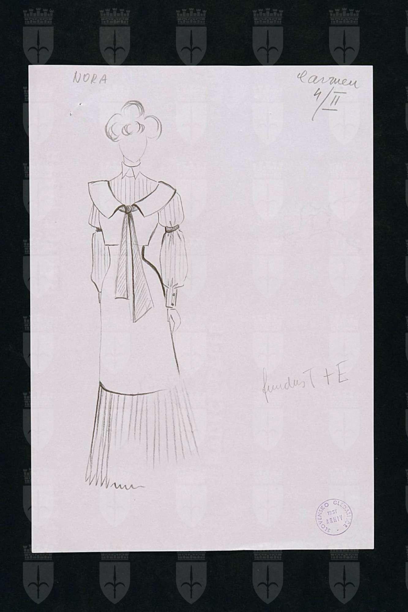 La coscienza di Zeno (Zenova Izpoved), di Italo Svevo nel rifacimento scenico di Tullio Kezich. Costume per Carmen, figura femminile intera, abito lungo con piegoline, grembiule con scollo rotondo, colletto e fiocco