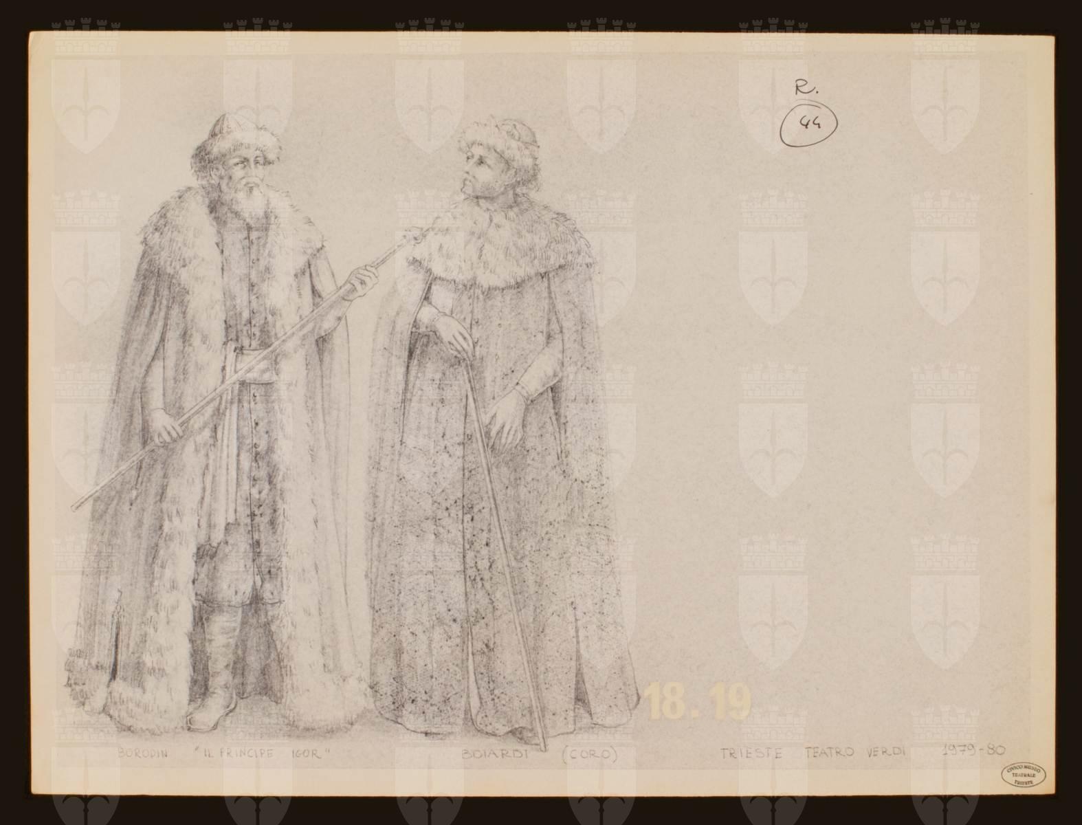 Il principe Igor, opera di Aleksandr Porfir'evič Borodin. Due costumi per boiardi ,due figure maschili intere in piedi. Personaggio di destra: indossa un copricapo bordato di pelliccia, manto con pelliccia e tiene un bastone con la mano destra. La figura di sinistra indossa un copricapo bordato di pelliccia, abito con abbottonatura centrale, fusciacca, stivali, manto con collo e bordi di pelliccia, bastone.