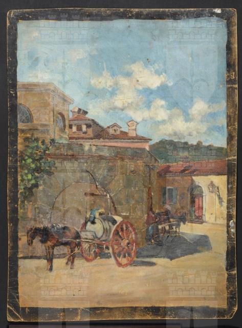 Come attestato da una scritta sul verso, il bozzetto ad olio su cartoncino è del pittore triestino Ernesto Croci ed è preparatorio per un dipinto, firmato e datato "Ern. Croci / 89", per ora di ubicazione ignota ma la cui esistenza è documentata da una foto dei CMSA (inv. 64/41097). Una scritta sul retro della foto dichiara che il dipinto fu esposto nel 1892 all'Esposizione Generale delle Belle Arti di Barcellona. Qui l'artista raffigurò uno scorcio della Piazza della Fontana della Zonta, oggi non più esistente, che era situata all'incrocio tra le vie della Zonta e Valdirivo: sulla sinistra si vede la mole della fontana in pietra, costituita da un corpo centrale ottagonale con copertura a spioventi e finestre a mezza luna circondato da un corpo più basso anch'esso ottagonale e mosso da arcate cieche a bugnato. La fontana fu costruita nel 1822 da Valentino Valle e Angelo Torian sul sito di una precedente fontana risalente al 1787, ricostruita nel 1821 dal capo muratore Felice Somazzi ma subito crollata per un violento nubifragio e per imperizia del Somazzi. Nel 1889 il Consiglio municipale ne decretò la sua demolizione e perciò il Croci in quest'opera ne volle documentare l'esistenza, prima che andasse distrutta (cfr. Fontane a Trieste, 1994). L'edificio basso sulla destra dovrebbe essere la corderia situata un tempo in via del Torrente (attuale via Carducci). Rispetto al bozzetto, databile anch'esso nel 1889, il dipinto presenta alcune leggere varianti nell'aggiunta in primo piano di un contadino in piedi visto di schiena accanto al carro con una botte trainato da un cavallo, e nelle due figure femminili in secondo piano intente a conversare.