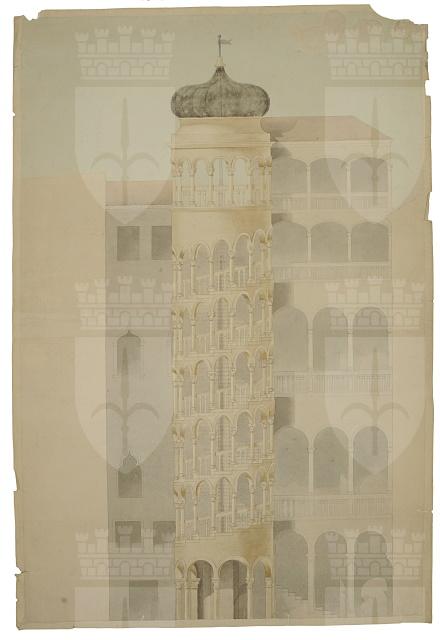 Come documentato nel Libro dei doni per gli anni 1910 - 1925, il disegno è di mano del pittore triestino Antonio Hollenbacher che lo eseguì durante gli anni di studio presso l'Accademia di Belle Arti di Venezia perciò presumibilmente tra la metà del quarto e la metà del quinto decennio del secolo, cioè tra il 1835 e il 1845, quando l'artista era tra i 19 e i 29 anni, essendo nato nel 1816. Il disegno raffigura un'opera celeberrima dell'architettura veneziana di fine Quattrocento, nel periodo di transizione tra Gotico e Rinascimento, e cioè la Scala Contarini Minelli del Bovolo, fatta costruire da Pietro Contarini per il suo palazzo tardo gotico di San Paternian. L'opera è attribuita a Giovanni Candi. Il disegno è una tipica esercitazione accademica e mostra le buone qualità di disegnatore di quest'artista, di cui i CMSA conservano un altro disegno giovanile (inv. 10/309).