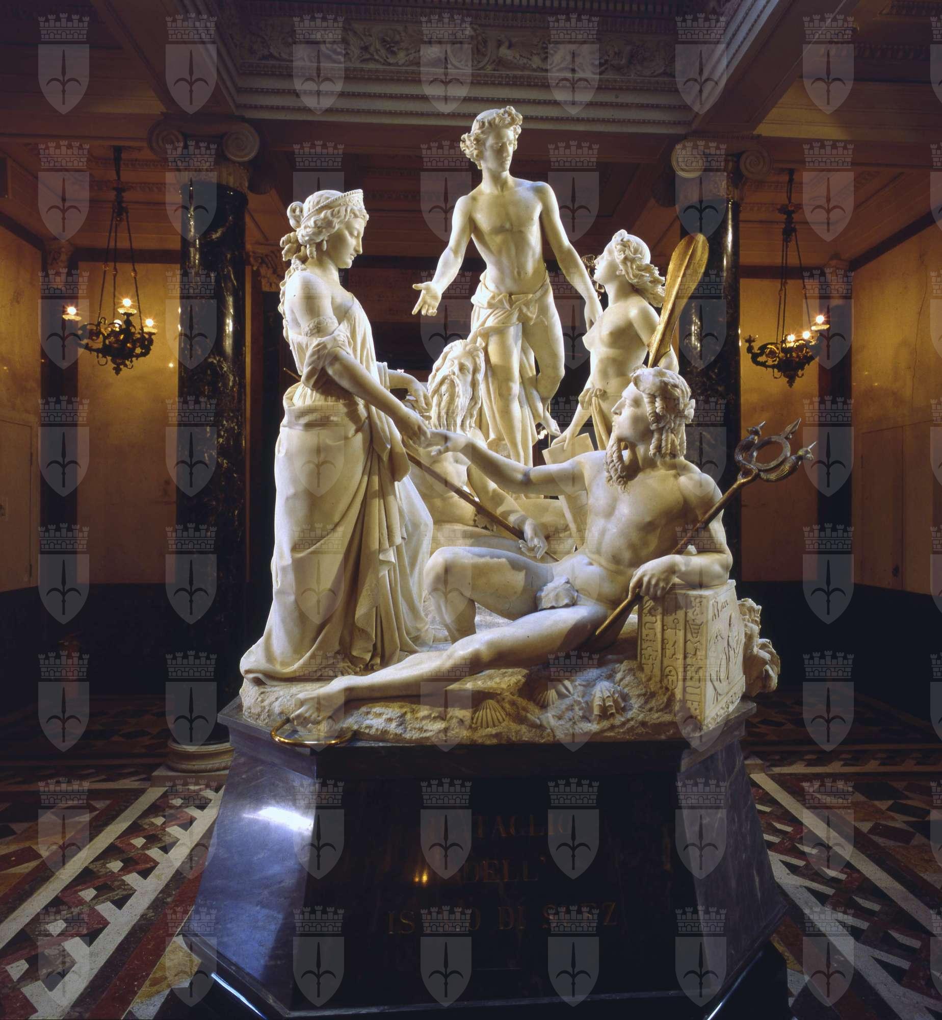 Quando il 23 febbraio 1859 Revoltella inaugurò la sua magnifica dimora con una festa sontuosa, alla presenza di illustri invitati, quali l’Arciduca Massimiliano d’Asburgo e Ferdinand de Lesseps, fu presentato il bozzetto in gesso del gruppo allegorico dedicato al "Taglio dell’Istmo di Suez", nello stesso anno in cui si avviavano i lavori in Egitto, sotto la direzione dello stesso Lesseps. Come l’articolata scultura della Ninfa Aurisina, anche questo imponente gruppo in marmo, che simbolicamente allude alla colossale impresa in terra africana, è collocato in una posizione di massima centralità e importanza all’interno di Palazzo Revoltella, nell’atrio del piano nobile, frutto di una oculata regia programmatica, non priva però di una certa attrattività. Revoltella, da molti anni impegnato nell’affaire de Suez, fu tra i primi azionisti e tra i più convinti sostenitori di questa grande impresa internazionale, nella sua città, nonché vicepresidente della Compagnia Universale del Canale di Suez. Recepito il messaggio, lo scultore milanese, tra i più capaci interpreti della mentalità positivista ottocentesca, ben adeguandosi alle esigenze della ricca committenza alto-borghese, tradusse le convinzioni del mecenate veneziano nell’equilibrato complesso di questo gruppo allegorico, formato dalla personificazione dell’Europa, che congiunge le mani dei due mari, caratterizzati con attributi e fogge diverse, e dalle due statue di Mercurio, svettante sul gruppo, e della Navigazione, giovane donna contrapposta all’Europa, di fattura impeccabile e armoniosa. La versione definitiva del gruppo, realizzata in marmo bianco e poggiante su un basamento in marmo «bardiglio e pietra di paragone», fu descritta sulle pagine dei giornali locali e, in seguito, inaugurata il 4 febbraio 1864, nell’ambito di una nuova importante occasione mondana. Nel 1864, alla bellezza raffinata del gruppo di Magni, portavoce di un promettente futuro, Revoltella affiancava, idealmente, un proprio contributo personale allo sviluppo economico generale, pubblicando il volume "La compartecipazione dell’Austria al commercio mondiale", volto a stimolare il governo austriaco a riconoscere l’importanza dei cambiamenti storici in atto e affinché si adoperasse «a tutta forza per dilatare il suo orizzonte politico-commerciale al fine di associarsi attivamente al commercio mondiale transoceanico».