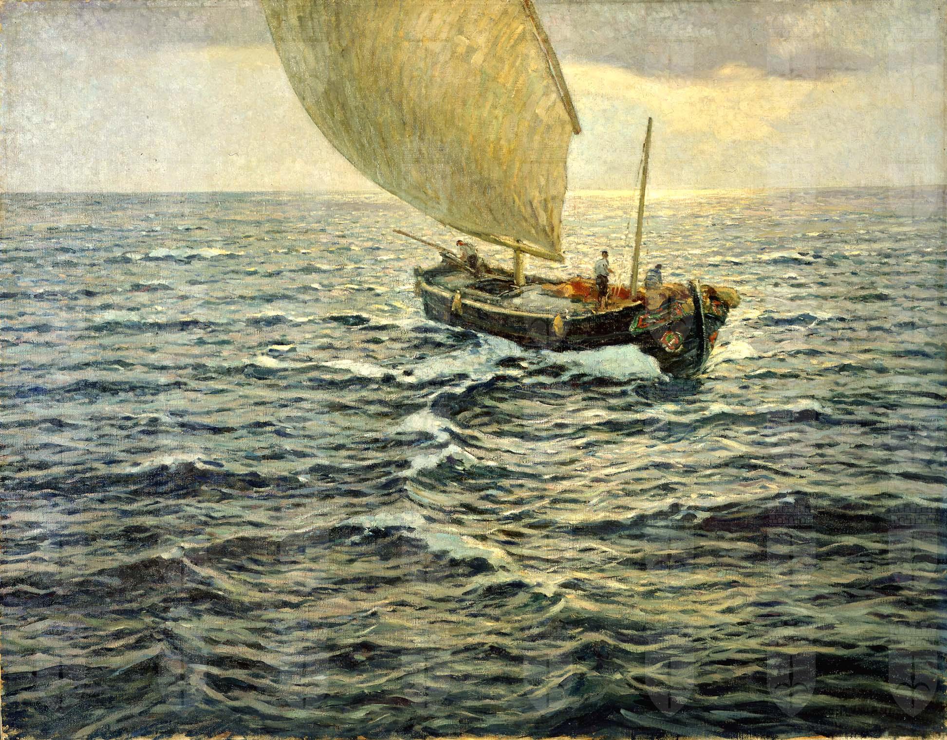 Il dipinto era esposto al centro della sala del Circolo Artistico in occasione della mostra personale di Ugo Flumiani organizzata nel dicembre del 1923. Silvio Benco nel recensire la mostra nota come l'artista, che aveva esposto anche il mese prima presso il salone Michelazzi, sia capace di far emanare una calda armonia dalle sue opere caratterizzate da un colore fulgido. In Ora d'argento, oltre a cogliere l'”animazione che essa reca in proporzioni così grandi e in soggetto così semplice” nota come si caratterizzi per “la vitalità pittorica che l'artista trova nella trasparenza del suo colore e nel movimento della sua pennellata”. La scelta operata dal Curatorio del museo risulta pertanto in linea con le opinioni del noto critico triestino. Dal verbale della seduta del 15 dicembre 1923 si apprende la volontà di assicurare alla collezione museale l'opera ritenuta non solo la migliore dell'esposizione alla quale era stata presentata in quello stesso mese ma una delle migliori fatte fino a quel momento dall'artista e per la quale furono corrisposte Lire 12.000 oltre alla restituzione di un quadro già acquistato dal museo precedentemente (l'acquisto venne effettuato con le rendite del lascito Cocchini). Il dipinto acquistato per la galleria triestina così come le opere presentate alle mostre della fine del 1923, in gran parte legate al tema del mare, costituiscono per il pittore un ritorno alla sua prima grande conquista per la quale è più noto, ma che aveva in parte abbandonato per lasciare spazio alle vedute di montagna, ampiamente documentate nella mostra del 1922. Dal punto di vista formale, rispetto alle opere dello stesso genere, si nota una tendenza alla semplificazione con la presenza di una sola imbarcazione isolata in mezzo al mare e resa attraverso un'originale impaginazione che lascia una parte della vela fuori dal dipinto. A differenza delle opere del primo periodo caratterizzate da un forte cromatismo, in seguito agli influssi impressionisti provenienti da Umberto Veruda, c'è la propensione da parte di Flumiani a rendere le immagini in maniera più lirica. Attento allo studio del vero, l'artista si dedica ripetutamente ai medesimi soggetti, già di moda qualche decennio prima, nelle varie condizioni di luce, evidenziando gli effetti nei suoi paesaggi a seconda delle diverse ore del giorno (prima di Ora d'argento realizzò anche Ora d'oro, 1909). Come ricorda Salvatore Sibilia l'artista conservava degli albums di Turner, pittore al quale guardava per tentare di esprimere “la naturalezza., nel senso che egli si preoccupa sopra tutto di riprodurre, con la sua arte, la natura quale essa è veramente, e i giuochi audaci e meravigliosi della sua luce.” (S. Sibilia, Pittori e scultori di Trieste, Trieste, 1922, p.116)