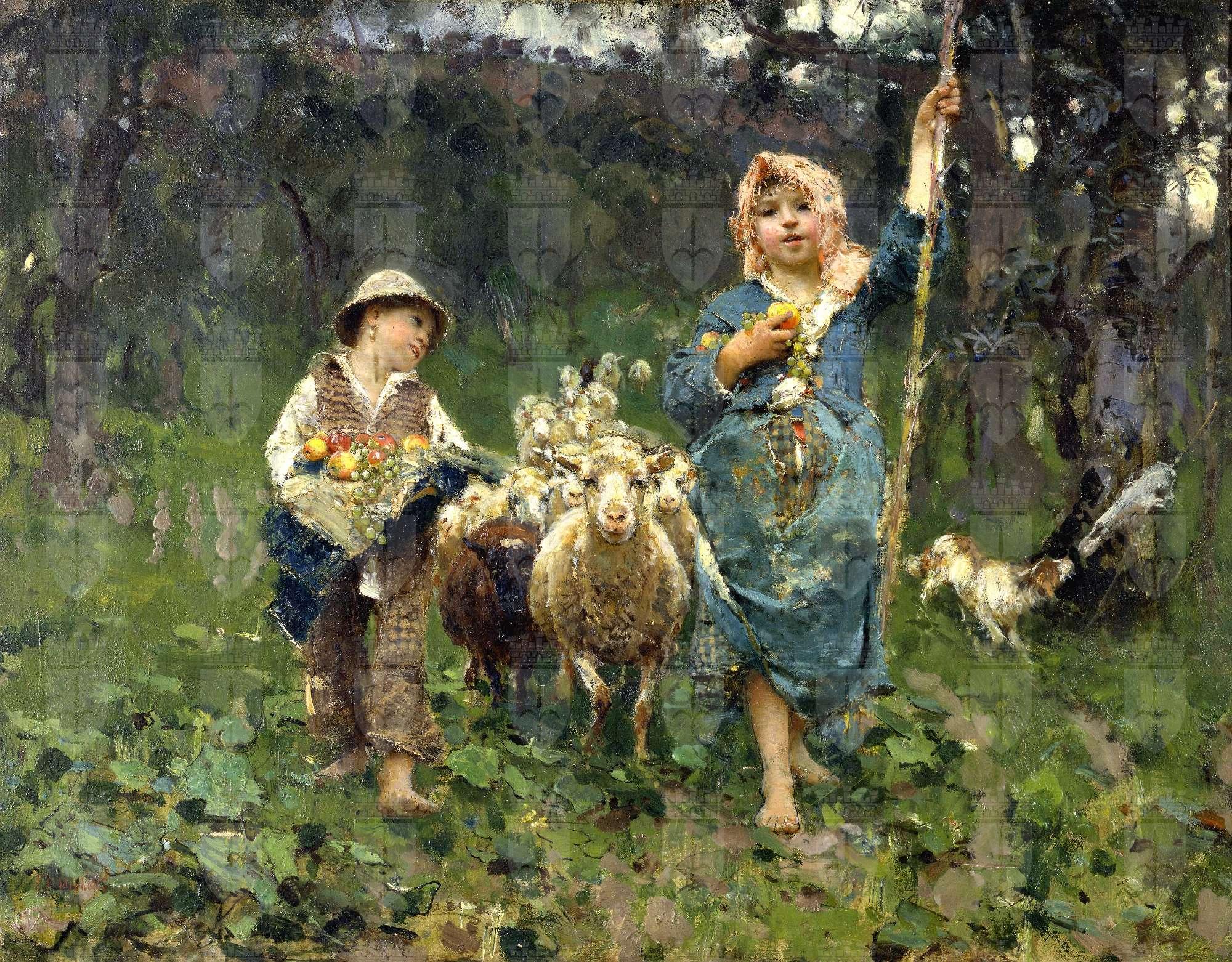 Il quadro dell'artista abruzzese non fu l'unica opera acquistata presso la famosa galleria fiorentina. In quell'occasione, infatti, Tominz e Scomparini dopo aver valutato le opere esposte alla galleria, appartenenti ad una collezione privata che raccoglieva dipinti di artisti italiani e stranieri della seconda metà del XIX secolo, optarono per una serie di "quadretti" di particolare rilievo, per la somma finale di 16.500, pattuita in seguito ad un'estenuante trattativa (Cuderi, 1995-'96). La modalità d'acquisizione delle quattro opere (oltre a Michetti, comparivano Barbudo, Barabino e Mosè Bianchi), costituì un'eccezione rispetto alla prassi consueta, in base a cui gli acquisti venivano effettuati per lo più in seno alle biennali veneziane o entro le mura cittadine. Il piccolo olio di Michetti, il cui valore monetario superava di gran lunga il prezzo degli altri tre dipinti (il prezzo unitario risulta essere di 12.000 lire, Archivio del Museo Revoltella, 4 maggio 1905), non è neppure l'unico lavoro dell'artista di Tocco Casauria nelle Collezioni del Museo. Si affianca ad esso, infatti, un dittico (olio su legno) intitolato Contadini abruzzesi (vd. scheda successiva) ed alcuni disegni a pastello, a tempera, gesso e carboncino costituenti la donazione di Giuseppe Angeli, passata alla raccolta museale nel 1921 (Archivio del Museo Revoltella, nota indirizzata alla Presidenza Municipale, 1922). Il dipinto Pastorelli delle Collezioni del Revoltella, oggetto del presente approfondimento, si inserisce a pieno titolo nell'ambito di quella parte della copiosa produzione michettiana che sembra risultare pervasa da una "tappezzeria di sensazioni sfarfallanti e stracciate" (Barilli, 1988), pittoricamente tradotte nell'infinita serie di pennellate frante e spumeggianti. L'antecedente di questo specifico fare pittorico, affiancato ad una produzione più meditata e composta che egli elaborò a partire dagli anni Ottanta (il Voto), viene generalmente individuato nella grande tela del Corpus Domini, realizzata per l'esposizione napoletana (1877) che decretò la piena affermazione dell'artista abruzzese in Italia e all'estero. Tuttavia, la sensibilità rivolta alla terra d'origine, non disgiunta dall'attenzione riservata alla descrizione meticolosa della sua gente e i relativi costumi, si delinea anche nei primissimi anni dell'esperienza napoletana. Non il Morelli e neppure il Palizzi o il Dalbono, che riconobbe subito la singolare personalità artistica del Michetti, suggestionarono in modo determinante le sue prime realizzazioni naturalistiche, bensì la "nostalgia" dell'Abruzzo natio che lo sospinse a vagabondare nei dintorni di Napoli, alla ricerca di ambienti familiari. "Ama i bimbi, le piante, i fiori, gli animali. I primi modelli che spontaneamente sceglie sono una Rosina e Costantino: i due fanciulli campagnoli che egli incontrava per uno dei sentieri con maggiore frquenza battuti. Ancora le loro teste, illuminate di meravigliosi sorrisi, si affacciano tra il verde di talune tavolette preziose" (Sillani, 1932). Gli stessi fanciulli potrebbero avere ispirato i protagonisti del piccolo olio in esame, ritratti alla testa di una fila ordinata di pecore, mentre avanzano con passo deciso verso l'osservatore, contraddistinti dalla serenità e spensieratezza che accomuna gli innumerevoli bimbi michettiani. A un'analisi più ravvicinata emerge il contrasto tra la restituzione compatta e turgida dei volti rosati, delle braccia, dei piedi dei bambini e la fluidità generale di colori e forme in cui appaiono immersi. Il leggerissimo ma evidente contorno scuro, definisce l'incedere delle due figurette sul terreno molle e vibrante, conferendo peso e suggerendo una vaga idea di profondità, accentuata ulteriormente dal rimpicciolimento progressivo e graduale degli animali alle loro spalle. L'insistenza su alcuni dati di eccessiva descrittività, talvolta superflui al discernimento del "vero", lasciano trapelare soprattutto una delle due anime dell'artista, individuate da Ojetti: quella del Michetti "idillico e capriccioso e scherzoso in cui il sottile veleno fortuniano è rimasto presente e l'inebbria tanto che ogni quadro di lui, sembra sempre una scommessa, vinta con lieta bravura " (Ojetti, 1929).