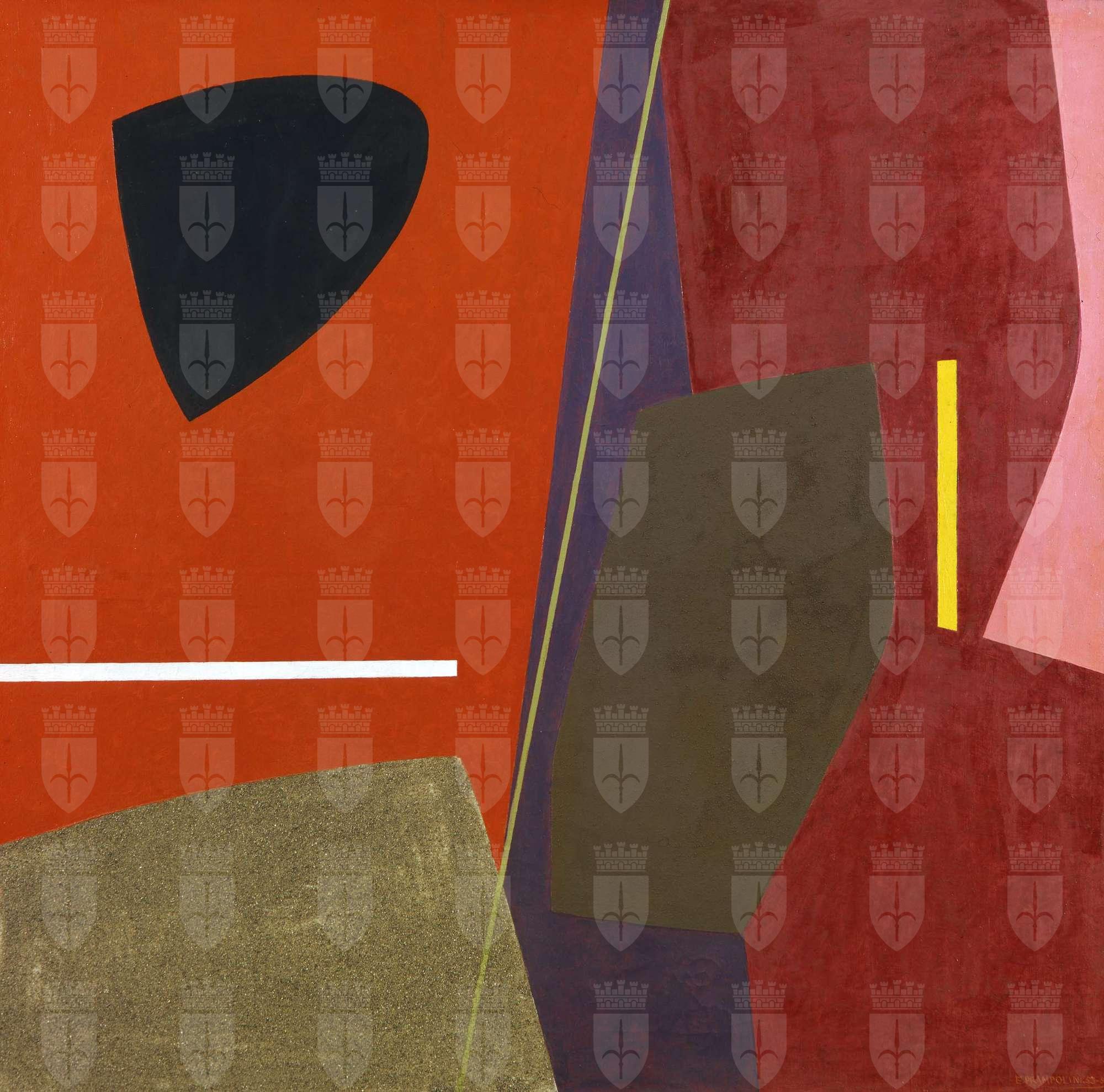 Alla Biennale di Venezia del 1954 questo polimaterico è stato esposto nella sala personale dedicata all'artista, accanto ad altri venti lavori eseguiti nel lungo arco cronologico che va dal 1914 al 1954; nella stessa occasione è stato acquistato (per la somma di 180.000 Lire) dal Museo Revoltella – assieme alle opere di Moreni, Corpora, Castelli e a uno studio di Spazzapan – secondo una politica museale di acquisti indirizzata prevalentemente verso la tendenza non figurativa dell'arte italiana. L'opera è firmata e datata in basso a destra “E. PRAMPOLINI 53-54”, ma è stata finora pubblicata con datazioni diverse, riferite tanto al 1953 quanto al 1954, poiché l'inventario del museo riporta la prima data, mentre il talloncino della Biennale - posto a tergo dell'opera - e una scritta autografa, rinvenuta dietro la riproduzione fotografica del suo archivio privato (come riferisce Menna in Prampolini, 1967, p. 253), la datano 1954. Non sembra, tuttavia, casuale il fatto che l'artista abbia riportato in calce all'opera la datazione 1953-54, intendendo forse far rilevare che essa è il frutto di un lungo lavoro di progettazione compositiva, documentato dai suoi due ultimi quaderni di studio (oggetto di una mostra organizzata nella galleria privata d'arte moderna “SM 13”, di via Margutta a Roma, tra il marzo e l'aprile del 1969). Nel primo dei due taccuini – che reca sulla copertina l'iscrizione autografa “Capri – Roma – 1953-54” – sono stati eseguiti, a matita nera o colorata, 466 minuscoli progetti (spesso non più grandi di un francobollo) di pitture da cavalletto, mentre nel secondo – che riporta la dicitura “Capri – Roma – 1953-54-56” e s'interrompe in corrispondenza alla data della scomparsa dell'autore, nel giugno del 1956 – vi sono 450 bozzetti di piccole dimensioni di opere in gran parte mai realizzate. Tali taccuini sono importantissimi per comprendere l'iter creativo dell'ultimo Prampolini, poiché dimostrano che “il suo modo di pensare un quadro era quello di impegnarsi attraverso una serie di sequenze, variando e semplificando per rendere sempre più significante l'immagine successiva, fino a raggiungere una perfetta proporzione fra gli elementi compositivi, tale che potesse reggere a tutti gli attacchi del suo acuto spirito critico” (M. Conte, Presentazione della mostra “Prampolini. Gli ultimi taccuini di studio 1953 – 1956”, Roma, SM 13, 1969). In questa, come nelle altre opere dipinte da Prampolini nel secondo dopoguerra, le tematiche cosmiche e le ricerche polimateriche – derivate dalle sue esperienze nell'ambito dell'aeropittura futurista e nei gruppi parigini non figurativi “Cercle et Carré” e “Abstraction-Création”, tra gli anni '20 e '30 – confluiscono in un linguaggio maggiormente attento alla forma geometrica dei campi cromatici e all'impaginazione degli stessi, al fine di dare all'opera d'arte un equilibrio ritmico-spaziale che le permette di esistere autonomamente, come un organismo dotato di leggi proprie. Anche la materia – nel caso in esame la sabbia, che ritroviamo nella campiutura in basso a sinistra e mescolata all'olio nella zona marrone - è “parte integrante della composizione polimaterica, i cui elementi formativi tendono a esprimere la continuità nella discontinuità, la dissonanza e l'assonanza di rapporti. Rapporti che, operando per contrasto, non valgono esclusivamente per la forma “dell'elemento-oggetto”, quanto per la presenza biologica della materia stessa”. (E. Prampolini, in Arte Polimaterica, Collana “Anticipazioni”, n. 7, O.E.T. Roma, Edizioni del Secolo, 1944). Anche Giuseppe Ungaretti, nel presentare la sala personale dell'artista alla Biennale di Venezia del 1954, ha evidenziato come, nella sua ultima produzione, “le tensioni, le dissonanze, le irradiazioni, le esplosioni, ogni violenza” trovino una superiore armonia nell' “infinita misura delle linee di forza” e “nel valore d'innovazione della materia che i rossi, che i gialli, che i bianchi, che i viola – l'uso stupefacente di tutto il giuoco degli innumerevoli neri – che i colori non più colori ma polpa stessa della materia affermano colmi di poesia”. (G. Ungaretti, in XXVII Esposizione Biennale…, cat. mostra, Venezia 1954, pp. 127).