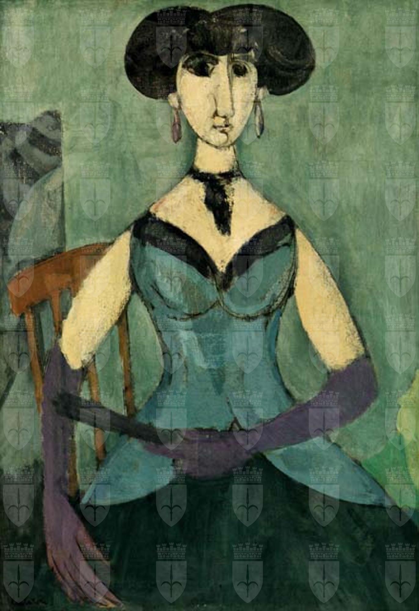 Ritratto di donna seduta frontalmente su una sedia, a tre quarti di figura, con un ventaglio nella mano sinistra. All'elegante abito da sera verde dalla profonda scollatura sono abbinati dei lunghi guanti che arrivano sopra i gomiti, un girocollo e orecchini a pendente.