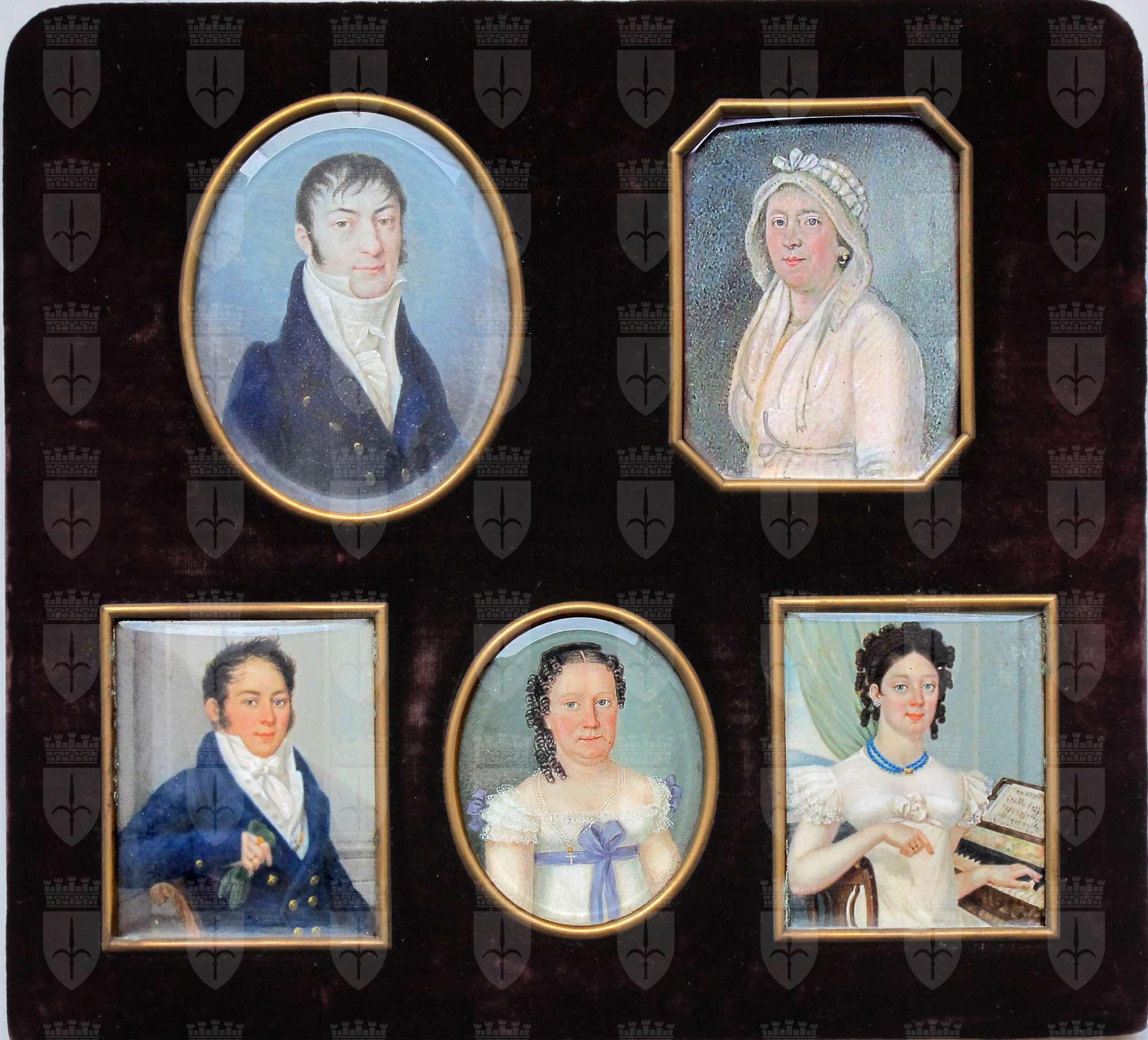 Il ritratto in miniatura, insieme a quelli agli invv. 21203-21206, collocati nella medesima cornice in velluto rosso, riproducono le effigi di una famiglia, non ancora individuata. Probabilmente l’insieme giunse nelle collezioni civiche attraverso il legato di Anna Sartorio nel 1947, come potrebbe attestare un’immagine storica (Ritratti a Trieste 1993, p. 11). Di certo l’effigie in esame è da riconoscere nel capostipite della famiglia. Egli indossa una rendigote blu a doppio petto, su panciotto bianco, con camicia e cravatta in tinta. La miniatura, per la firma, è ascrivibile al pittore austriaco Johann Weixlbaum (Vienna, 1752-1840), allievo di Heinrich Friedrich Füger.