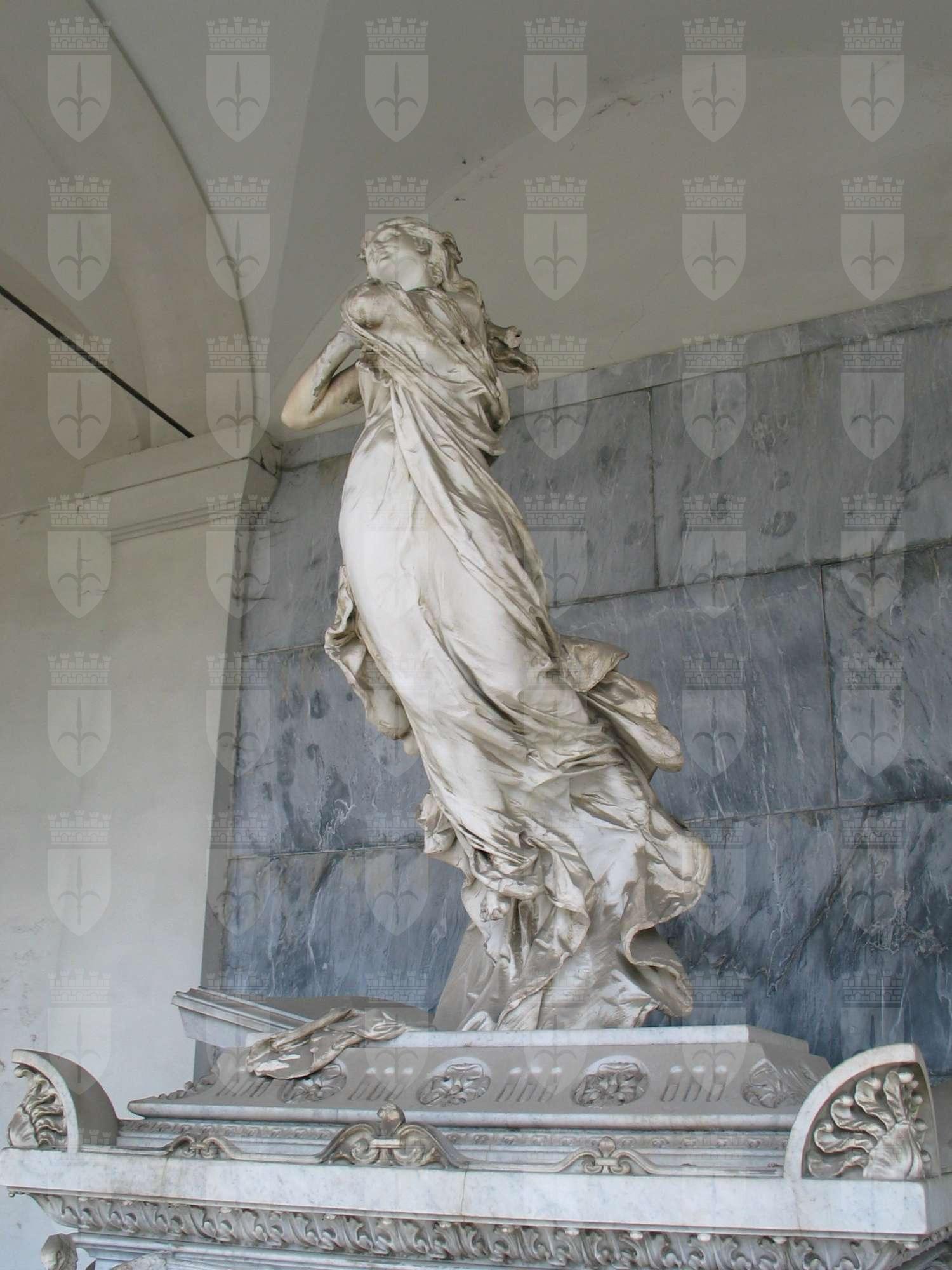 Sull'arca - i cui angoli sono decorati con fenici ad ali spiegate - si erge una figura femminile dolente in ascesa con le mani giunte e la veste mossa dal vento. Il sarcofago poggia su un basamento gradinato, alle estremità del quale sono posti quattro candelabri in bronzo che reggono, insieme ad elementi vegetali intermedi, una corda pure in bronzo.