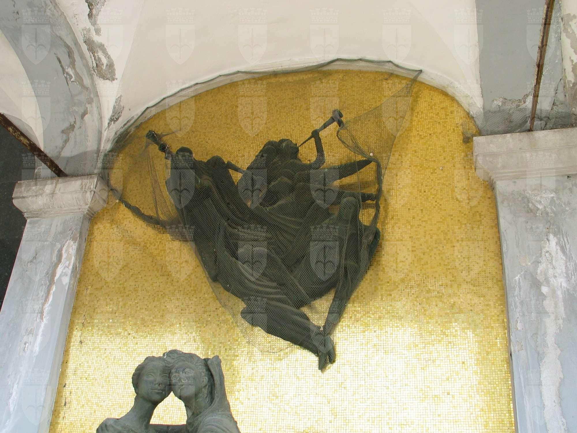 Su un basamento a tre gradini sono due figure femminili, la Fede e la Speranza, in atto di abbracciarsi; alle loro spalle, sulla sommità della dorata parete di fondo, sta un gruppo di angeli musicanti in volo. Sulla destra è posizionato un grande vaso decorato a rilievo con angeli di spalle nell'atto di sorreggere una ghirlanda.