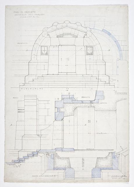 Si tratta di uno dei disegni progettuali del Faro della Vittoria, eseguiti da Arduino Berlam, che li donò ai Civici Musei di Storia ed Arte nel 1935, cfr. le schede da CMSAOAR06_3598 a CMSAOAR06_3634. In particolare, la tavola, già pubblicata nel 1919, sulle pagine de “L’architettura italiana”, descrive nel dettaglio l'ingresso al faro. Proprio a partire da quell’anno, Arduino Berlam lavorò alla progettazione del Faro della Vittoria, architettura celebrativa e simbolica, che rispondeva al desiderio di esaltazione della patria e dell’italianità di Trieste redenta, sorto dopo la Grande Guerra, e alla necessità di onorare i suoi caduti. Già durante il conflitto, Berlam aveva ipotizzato di erigere un faro in onore di Nazario Sauro, eroe del mare, sulla punta istriana di Salvore, a poca distanza da Capodistria (cfr. CMSAOAR06_3631). Tuttavia questa prima idea fu modificata a guerra conclusa, quando la Lega navale propose di costruire il faro a Trieste, per sostituire l’obsoleta lanterna di Pietro Nobile. Dal giugno 1919, quando il progetto di massima venne approvato dal Consiglio Superiore dei Lavori Pubblici a Roma, al 1927, quando il faro fu inaugurato, il suo iter costruttivo fu tormentato da problemi e ritardi causati da divergenze di ordine tecnico-artistico e dall’antagonismo contro Arduino Berlam. Edificato sulle fondamenta del forte austriaco Kressich, costruito sul colle di Gretta nel 1854, su progetto dell'architetto Karl Möring, il faro presenta una gradinata monumentale alla cui sommità si trova un solettone. Su di esso è posta la lapide con l'epigrafe dedicatoria «A. D. MCMXXVII / SPLENDI E RICORDA / I CADUTI SUL MARE / MCMXV – MCMXVIII». Il manufatto prosegue con uno zoccolo a campana da cui pende l'àncora del caccia-torpediniere Audace, che il 3 novembre 1918 attraccò sul molo triestino ad esso intitolato. Sull'avancorpo del ballatoio, da cui si innalza il fusto della colonna, poggia la statua del Marinaio ignoto, eseguita da Giovanni Mayer. La colonna, in cemento armato, è rivestita da blocchi di pietra di Orsera e termina con un capitello che sorregge il terrazzo su cui poggia la lanterna. Quest'ultima è circondata da un ulteriore ballatoio in ferro ed è coronata da una cupola di rame a squame, su cui svetta una Vittoria alata, opera anch'essa di Mayer e forgiata da Giacomo Sreboth.