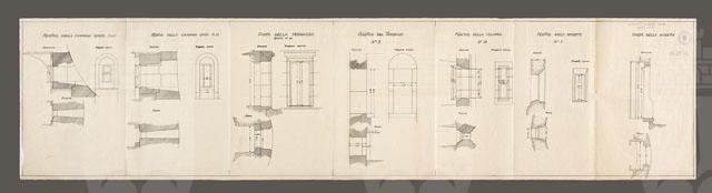 Il foglio è suddiviso in sette sezioni: feritoie della campana quota 11,665; feritorie della campana quota 14.52; porta della terrazza quota 17.66; feritoie del tamburo n.° 3; feritoie della colonna n.° 12; feritoie della murette n.° 3; porta della murette. Ciascuna sezione presenta il disegno della sezione, il prospetto interno e la pianta.
