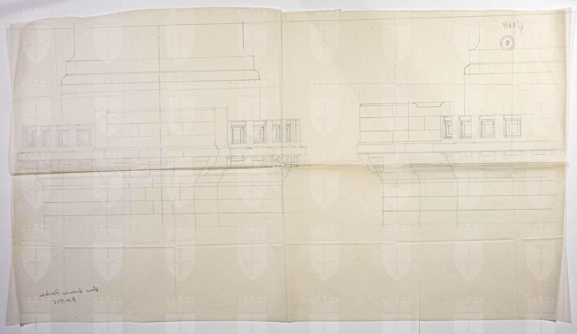 Studio preparatorio per il ballatoio con avancorpo: prospetto frontale e semiprospetto laterale.