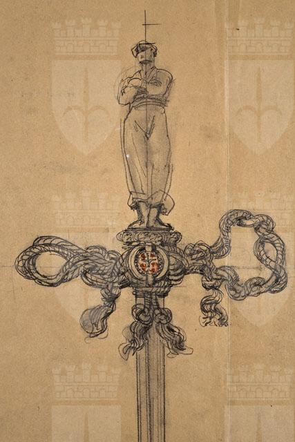 Si tratta di uno dei disegni progettuali del Faro della Vittoria, eseguiti da Arduino Berlam, che li donò ai Civici Musei di Storia ed Arte nel 1935, cfr. le schede da CMSAOAR06_3598 a CMSAOAR06_3634. In particolare, l'opera in esame testimonia le fasi ideative dello spadino d'onore donato dalla città di Trieste al grand'ammiraglio Paolo Camillo Thaon di Revel (Torino, 1859-Roma, 1948) il 3 febbraio 1924. Quest'ultimo, già capo di Stato Maggiore della Marina e comandante della flotta italiana durante la Grande Guerra, aveva donato al Comitato del Faro l'àncora del cacciatorpediniere Audace, che il 3 novembre 1918 aveva attraccato a Trieste, segnando la vittoria italiana sull'Impero austro-ungarico. Oltre all'àncora, l'ammiraglio consegnò la relativa catena e due proiettili della corazzata austroungarica "Viribus Unitis", affondata a Pola il 1° novembre 1918 (Zerboni 1999, pp. 72-75). Presso l'Archivio Generale del Comune di Trieste (Segreteria generale, prot.corr. 5/123-1923) si conserva il bozzetto definitivo della spada, eseguito da Arduino Berlam. Essa venne forgiata con una lama di baionetta della Brigata Sassari: l'impugnatura in argento ossidato era costituita dalla figura di marinaio che Giovanni Mayer aveva ipotizzato quale primo elemento decorativo del Faro, l'elsa composta da un intreccio di gomene a racchiudere lo stemma di Trieste in corallo con l'alabarda in platino. La statuetta venne fusa da Isidoro Bragadin di Venezia, mentre l'elsa dall'orefice Carlo Omet (cfr. Bigi - Guidi - Ugolini Bernasconi 2003, pp. 476-477).