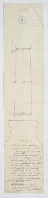 Disegno a matita. Nella parte superiore del foglio: alzato di colonna, poggiante su alto basamento, con indicati tre punti con le lettere A,B,C; nella parte inferiore: lunga iscrizione.