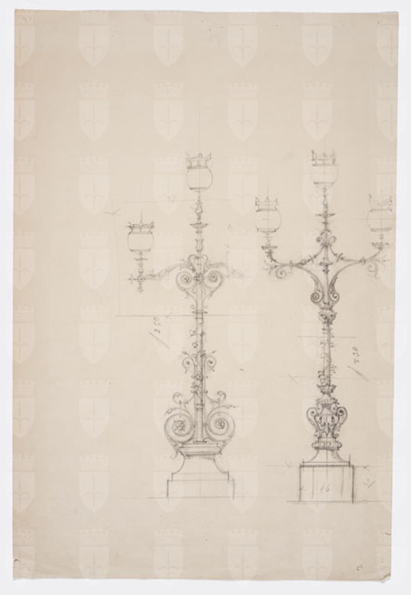 Studio parzialmente quotato per due lampade a candelabro dalla diversa struttura compositiva, per il Faro della Vittoria.