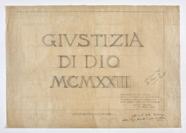 Progetto per un'epigrafe da incidersi, come recita l'iscrizione, sotto l'aquila austriaca murata nei sotterranei del Faro della Vittoria. Eseguito dall'architetto Arduino Berlam il 30 ottobre 1923, fu approvato dalla Presidenza della Lega Navale il giorno successivo. Si tratta di uno dei disegni progettuali del Faro della Vittoria, donati da Arduino Berlam ai Civici Musei di Storia ed Arte nel 1935, cfr. schede da CMSAOAR06_3598 a CMSAOAR06_3634. Per le vicende storico-critiche del Faro della Vittoria, si rinvia alla scheda CMSAOAR06_3598.