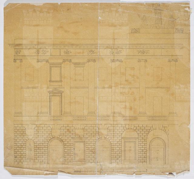 Secondo Pavan, il disegno, che rappresenta la metà sinistra del prospetto principale del Teatro Verdi in scala 1:50, può essere attribuito all'ing. Eugenio Geringer, che fin dal 1882 si era occupato di un restauro dell'edificio. "L'identica modellazione dei capitelli ionici, la corrispondenza delle misure con la facciata verso il mare [...] fanno pensare che il rilievo sia stato utilizzato per la progettazione di quel prospetto e quindi eseguito con questo preciso scopo" (Pavan 1988, pp. 80-81). Nel disegno è tratteggiata anche la decorazione scultorea dell'edificio: l'Apollo citaredo affiancato da due muse, le metope con strumenti musicali e la scultura di Plutone nella nicchia del basamento a sinistra.