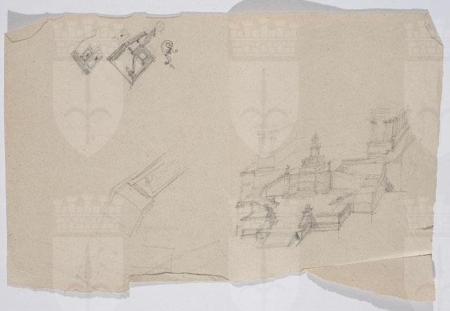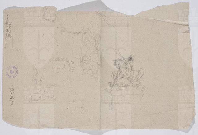 Schizzo del monumento in onore di Vittorio Emanuele II. Sul recto, abbozzo generale del monumento e dettagli architettonici; sul verso, studio per la statua equestre e il suo basamento.