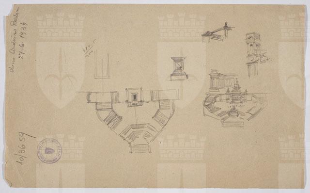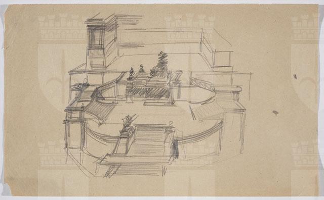 Sul recto, schizzo a matita raffigurante veduta prospettica del monumento in onore di Vittorio Emanuele II. Sul verso, altro studio del monumento, schizzo della planimetria delle prime due piattaforme e altri dettagli architettonici.