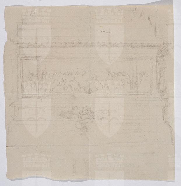 Studio a matita del basamento del monumento equestre con bassorilievo figurato. Sul verso, schizzo a penna, in alzato e pianta, del volume del colonnato con indicati nomi di uomini illustri in corrispondenza di punti.