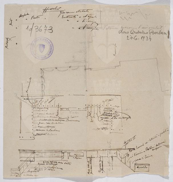 Il disegno fa parte di una serie di studi per il Monumento nazionale a Vittorio Emanuele II, cfr. schede CMSAOAR10_3646-CMSAOAR10_3688. Ruggero Berlam partecipò al secondo concorso per il monumento a Vittorio Emanuele II a Roma, indetto dal momento che la prima selezione, svoltasi nel 1880, non ebbe un vincitore. Nel primo bando l’unico vincolo posto ai progettisti era stato quello del costo; il secondo, pubblicato il 18 dicembre 1882, prevedeva di collocare il monumento sul colle Capitolino e ne fissava alcune caratteristiche: un fondale architettonico e una statua di Vittorio Emanuele II, dapprima seduto su un trono, poi a cavallo. Secondo Sticotti, Berlam inviò il progetto in incognito da Milano, per non essere riconosciuto come austriaco; ma dopo esser stato esposto a Roma, esso fu fatto sparire, su volontà del primo ministro Agostino Depretis, per non turbare i rapporti che si erano creati con l’Austria. Il concorso, cui parteciparono 98 progettisti, fu vinto da Giuseppe Sacconi, con un progetto che presenta affinità con quello di Ruggero Berlam; secondo classificato Manfredo Manfredi, terzo Bruno Schmitz. In seguito, vi fu un terzo bando ristretto ai primi tre classificati, vinto da Sacconi. Il progetto di Berlam, incentrato su purezza e classicità di linee (Marsoni 1986, p. 112), presenta una parte basamentale forte e compatta, alta la metà del monumento, che non avrebbe consentito di vedere il colonnato dalla Piazza Venezia, ma solo da via del Corso: un errore progettuale fatale, che, secondo Pozzetto, ne sancì l’eliminazione (1999, pp. 90-91). Il disegno in esame presenta uno schizzo del sotto-basamento del monumento equestre, sul recto; mentre il verso è dedicato all'organizzazione dei gruppi scultorei di uomini illustri posti all'ombra del monumentale colonnato (cfr. il prospetto definitivo in Pozzetto 1999, pp. 90-91, figg. 152-153).