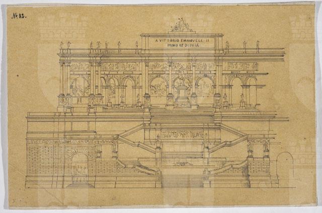 Copia del progetto N. 82 del monumento da erigersi a Roma in onore di Vittorio Emanuele II, su carta da lucido, applicata su carta. Sul verso, semiplanimetria dello stesso.