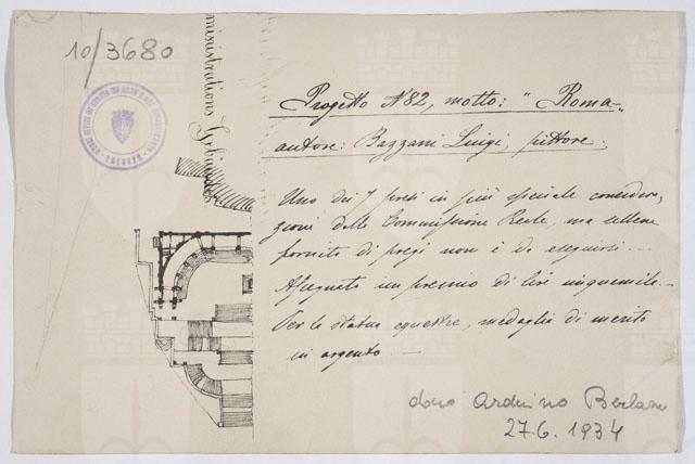 Il disegno è annesso alla serie di studi per il Monumento nazionale a Vittorio Emanuele II, cfr. schede CMSAOAR10_3646-CMSAOAR10_3688, eseguiti da Ruggero Berlam. Egli partecipò al secondo concorso per il monumento a Vittorio Emanuele II a Roma, indetto dal momento che la prima selezione, svoltasi nel 1880, non ebbe un vincitore. Nel primo bando l’unico vincolo posto ai progettisti era stato quello del costo; il secondo, pubblicato il 18 dicembre 1882, prevedeva di collocare il monumento sul colle Capitolino e ne fissava alcune caratteristiche: un fondale architettonico e una statua di Vittorio Emanuele II, dapprima seduto su un trono, poi a cavallo. Secondo Sticotti, Berlam inviò il progetto in incognito da Milano, per non essere riconosciuto come austriaco; ma dopo esser stato esposto a Roma, esso fu fatto sparire, su volontà del primo ministro Agostino Depretis, per non turbare i rapporti che si erano creati con l’Austria. Il concorso, cui parteciparono 98 progettisti, fu vinto da Giuseppe Sacconi, con un progetto che presenta affinità con quello di Ruggero Berlam; secondo classificato Manfredo Manfredi, terzo Bruno Schmitz. In seguito, vi fu un terzo bando ristretto ai primi tre classificati, vinto da Sacconi. Quanto al disegno in esame, si tratta di una copia del progetto N. 82 presentato al secondo concorso dal pittore Luigi Bazzani (Bologna, 1836 - Roma, 1927) che ricevette un premio di cinquemila lire per l'architettura e una medaglia di merito in argento per la statua equestre.