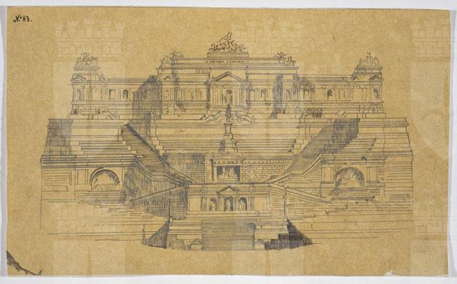 Copia del progetto N. 83 del monumento da erigersi a Roma in onore di Vittorio Emanuele II, su carta da lucido, applicata su carta. Sul verso, semiplanimetria del monumento stesso e tracce di altra planimetria (il foglio è un frammento di riuso).