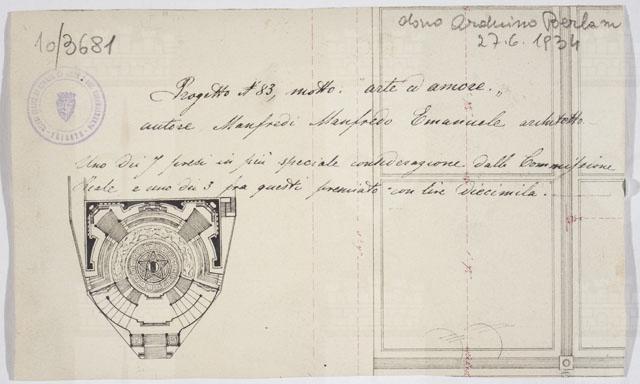 Il disegno è annesso alla serie di studi per il Monumento nazionale a Vittorio Emanuele II, cfr. schede CMSAOAR10_3646-CMSAOAR10_3688, eseguiti da Ruggero Berlam. Egli partecipò al secondo concorso per il monumento a Vittorio Emanuele II a Roma, indetto dal momento che la prima selezione, svoltasi nel 1880, non ebbe un vincitore. Nel primo bando l’unico vincolo posto ai progettisti era stato quello del costo; il secondo, pubblicato il 18 dicembre 1882, prevedeva di collocare il monumento sul colle Capitolino e ne fissava alcune caratteristiche: un fondale architettonico e una statua di Vittorio Emanuele II, dapprima seduto su un trono, poi a cavallo. Secondo Sticotti, Berlam inviò il progetto in incognito da Milano, per non essere riconosciuto come austriaco; ma dopo esser stato esposto a Roma, esso fu fatto sparire, su volontà del primo ministro Agostino Depretis, per non turbare i rapporti che si erano creati con l’Austria. Il concorso, cui parteciparono 98 progettisti, fu vinto da Giuseppe Sacconi, con un progetto che presenta affinità con quello di Ruggero Berlam; secondo classificato Manfredo Manfredi, terzo Bruno Schmitz. In seguito, vi fu un terzo bando ristretto ai primi tre classificati, vinto da Sacconi. Quanto al disegno in esame, si tratta di una copia del progetto N. 83 presentato da Emanuele Manfredo Manfredi e selezionato tra i primi tre dalla Commissione Reale, che lo premiò con diecimila lire.