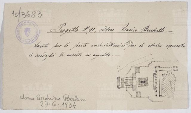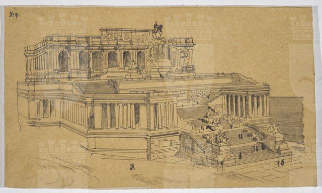 Il disegno è annesso alla serie di studi per il Monumento nazionale a Vittorio Emanuele II, cfr. schede CMSAOAR10_3646-CMSAOAR10_3688, eseguiti da Ruggero Berlam. Egli partecipò al secondo concorso per il monumento a Vittorio Emanuele II a Roma, indetto dal momento che la prima selezione, svoltasi nel 1880, non ebbe un vincitore. Nel primo bando l’unico vincolo posto ai progettisti era stato quello del costo; il secondo, pubblicato il 18 dicembre 1882, prevedeva di collocare il monumento sul colle Capitolino e ne fissava alcune caratteristiche: un fondale architettonico e una statua di Vittorio Emanuele II, dapprima seduto su un trono, poi a cavallo. Secondo Sticotti, Berlam inviò il progetto in incognito da Milano, per non essere riconosciuto come austriaco; ma dopo esser stato esposto a Roma, esso fu fatto sparire, su volontà del primo ministro Agostino Depretis, per non turbare i rapporti che si erano creati con l’Austria. Il concorso, cui parteciparono 98 progettisti, fu vinto da Giuseppe Sacconi, con un progetto che presenta affinità con quello di Ruggero Berlam; secondo classificato Manfredo Manfredi, terzo Bruno Schmitz. In seguito, vi fu un terzo bando ristretto ai primi tre classificati, vinto da Sacconi. Quanto al disegno in esame, si tratta di una copia del progetto N. 91 presentato da Enrico Becchetti che ricevette una medaglia di merito in argento per la parte archiettonica e la statua equestre.