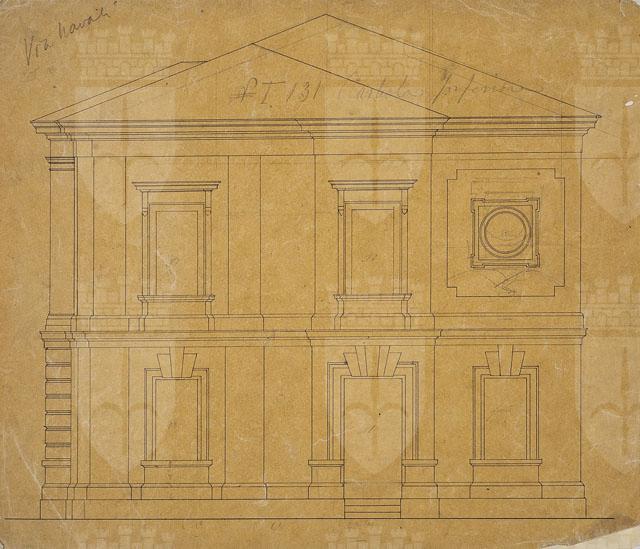 Disegno preparatorio. L'appunto "via Navali" suggerisce si tratti dello studio per un prospetto di uno dei villini realizzati da Ruggero Berlam nella zona di San Vito a Trieste. Confrontando il disegno in esame con il progetto pubblicato da Pozzetto (1999, p. 98, fig. 172), si propone di riconoscervi uno studio per una facciata laterale della casa di campagna eretta su una frazione dell'area Chiarbola inferiore n. 131, corrispondente a via Navali n. 12, per gli eredi di Andrea Ganzoni e di Tommaso Livesey. Presso l'Archivio Generale del Comune di Trieste (Archivio Pianificazione Urbana, ser. disegni 5308/0) si conserva il progetto, completo di prospetto principale, sezione e planimetria, presentato al Magistrato Civico cittadino, che lo approvò nel 1881; data che può esser estesa anche al disegno dei Civici Musei di Storia ed Arte.