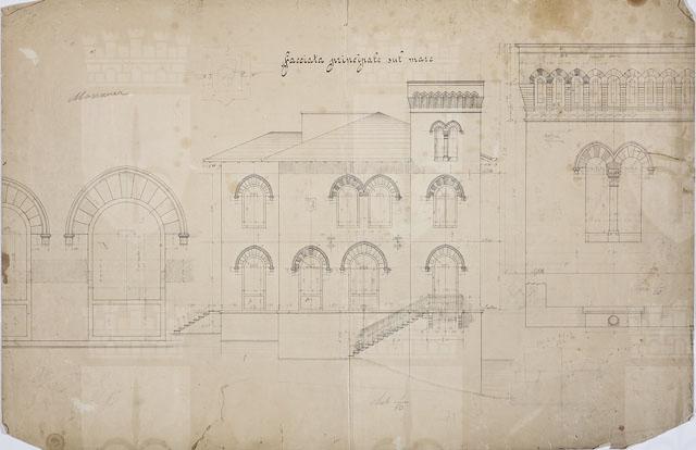 Disegno architettonico decurtato. Al centro è descritta la facciata principale di una villa in scala 1:50. A sinistra, è sviluppato il particolare delle finestre del primo livello; mentre a destra, dettaglio dell'alzato della torretta con bifora, pianta di quest'ultima, in scala 1:20. Sul verso, schizzo planimetrico.