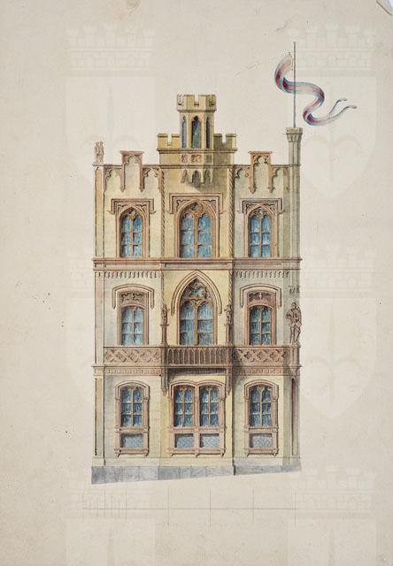 Si tratta dello studio per la facciata laterale di una villa o castelletto di tipo gotico inglese, una delle declinazioni dell’Eclettismo, che segnò, dopo la fioritura dell’arte neoclassica, una nuova stagione architettonica a Trieste nella seconda metà dell’Ottocento. Secondo Pozzetto, che data il disegno al 1854, si tratta del progetto eseguito da Giovanni Antonio Berlam per la villa Mauroner (Pozzetto 1999, p. 72). Per lo studio della facciata principale, cfr. CMSAOAR10_4106.