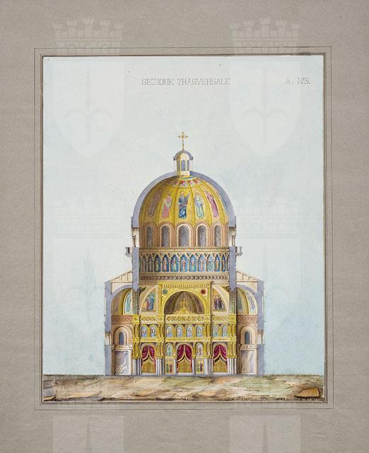 Entro passe-partout riquadrato, disegno ad acquerello, raffigurante la sezione trasversale di una chiesa di rito orientale con l'iconostasi e le sue decorazioni.