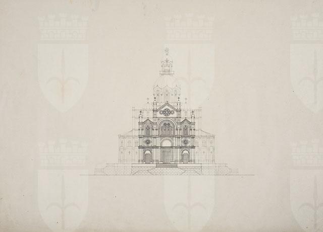 Si tratta di uno dei disegni del "Progetto di chiesa di tipo romanico con pianta a croce latina, con campanile posteriore" (cfr. CMSAOAR10_4129 - CMSAOAR10_4134), pervenuti nel 1953 nelle collezioni dei Civici Musei di Storia ed Arte attraverso l’acquisto Lituano Samero.