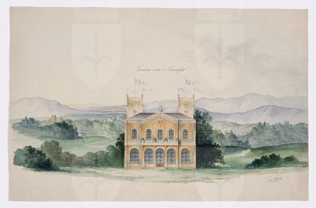 Disegno acquarellato raffigurante prospetto di villino entro un paesaggio. L'edificio, con due livelli sopra il suolo, è scandito da cinque grandi aperture ad arco al piano terreno ed altrettante, di dimensioni minori, al piano superiore, distinto dal primo, attraverso una balaustrata continua, che, nella parte centrale aggettante, si trasforma in balcone. La parte aggettante termina a guisa di frontone con oculo. Il fabbricato è concluso da un'alta cimasa. Sul retro, l'edificio è chiuso da due torri laterali.