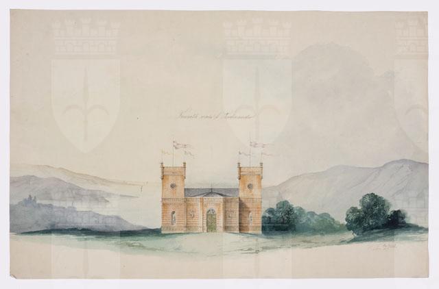 Disegno acquarellato raffigurante il prospetto di un edificio che domina un paesaggio con un golfo in lontananza. L'edificio, dal volume compatto, presenta due torri laterali che racchiudono un settore centrale lievemente avanzato, su cui si apre un portone ad arco. Fasce ornamentali con dettagli in pietra bianca segnano il basamento e la cimasa della parte aggettante; nicchie con statue e trofei di armi contribuiscono alla decorazione dell'edificio, trattato a conci lisci al piano terreno.
