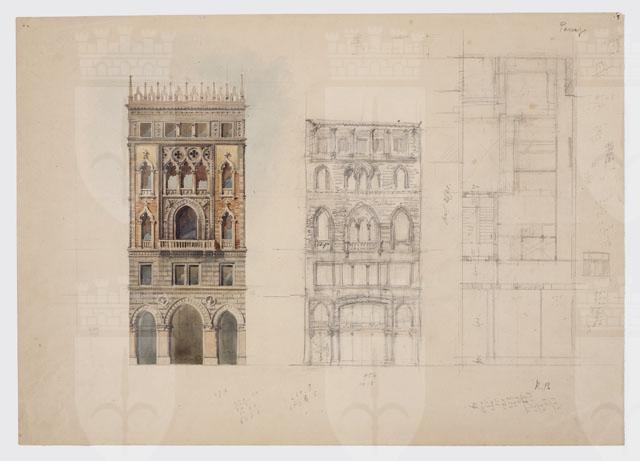 Tavola dedicata alla progettazione di un edificio in stile gotico-veneziano. Presenta uno schizzo della facciata e della sua planimetria, rispettivamente al centro e a destra. A sinistra, una rielaborazione più dettagliata della facciata, eseguita ad acquerello.