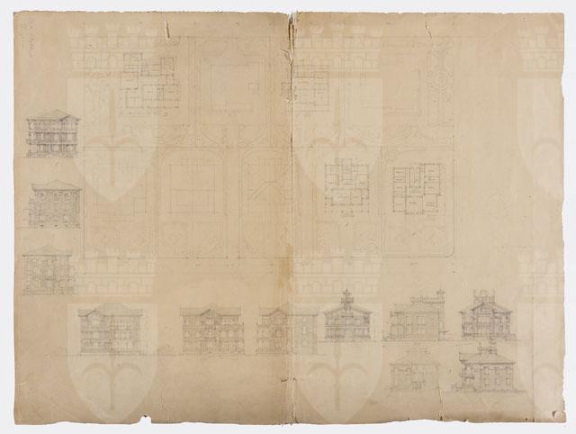 Tavola contenente studi di prospetti e planimetrie per villino a due o tre livelli. Nelle planimetrie, studio della distribuzione degli edifici con definizione della destinazione d'uso (scritte all'interno dei locali).