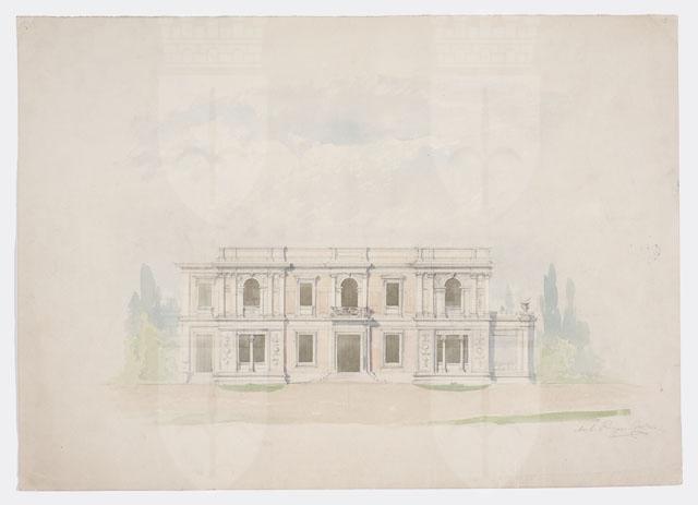 Disegno a matita e acquerello policromo, raffigurante prospetto di villino a due livelli.