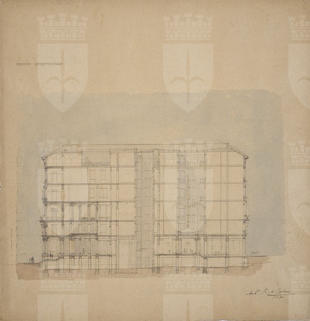 Disegno a matita e acquarellature, raffigurante la sezione longitudinale dell'edificio della Riunione Adriatica di Sicurtà.